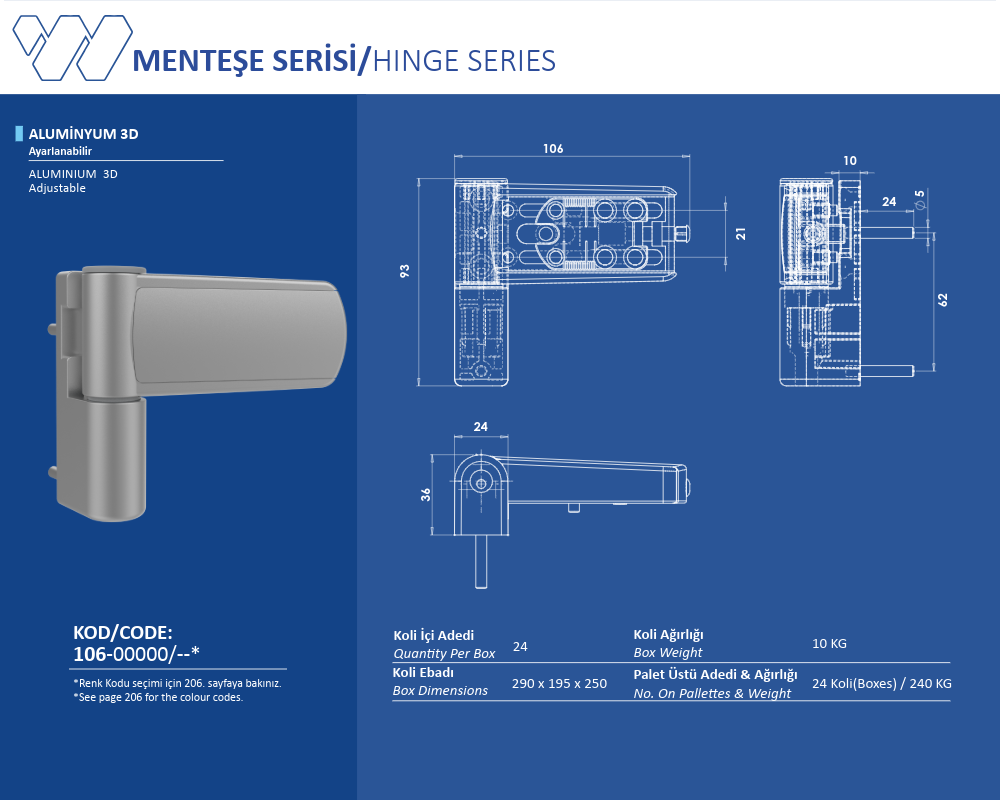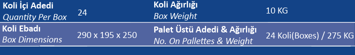 Palet Üstü Adedi & Ağırlığı (No. on Palettes & Weight) 24 Koli (Boxes) 275 KG