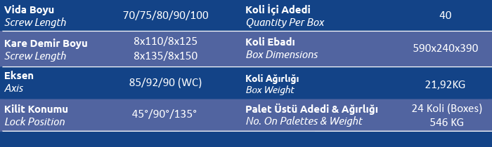 Palet Üstü Adedi & Ağırlığı (No. on Palettes & Weight) 24 Koli (Boxes) 546 KG