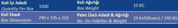 Palet Üstü Adedi & Ağırlığı (No. on Palettes & Weight) 24 Koli (Boxes) 240 KG