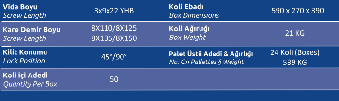 Palet Üstü Adedi & Ağırlığı (No. on Palettes & Weight) 24 Koli (Boxes) 539 KG